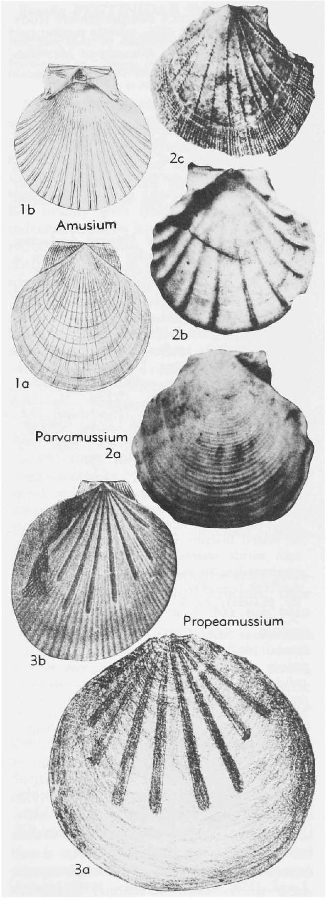 Fairly large, thin, valves slightly convex and gaping along margins below auricles; trace of byssal notch present; internal lirae commonly in pairs; hinge with pair of short ridges diverging from shallow ligamental pit and extending toward margins; auricular crura present (256a-e).