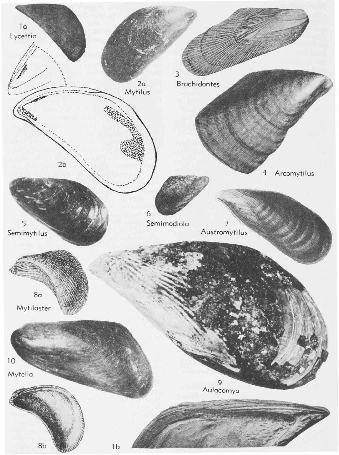 Mytiliform, beaks terminal or nearly so, radially sculptured with bifurcating ribs, ligament relatively short, hinge with dysodont teeth before and after ligament