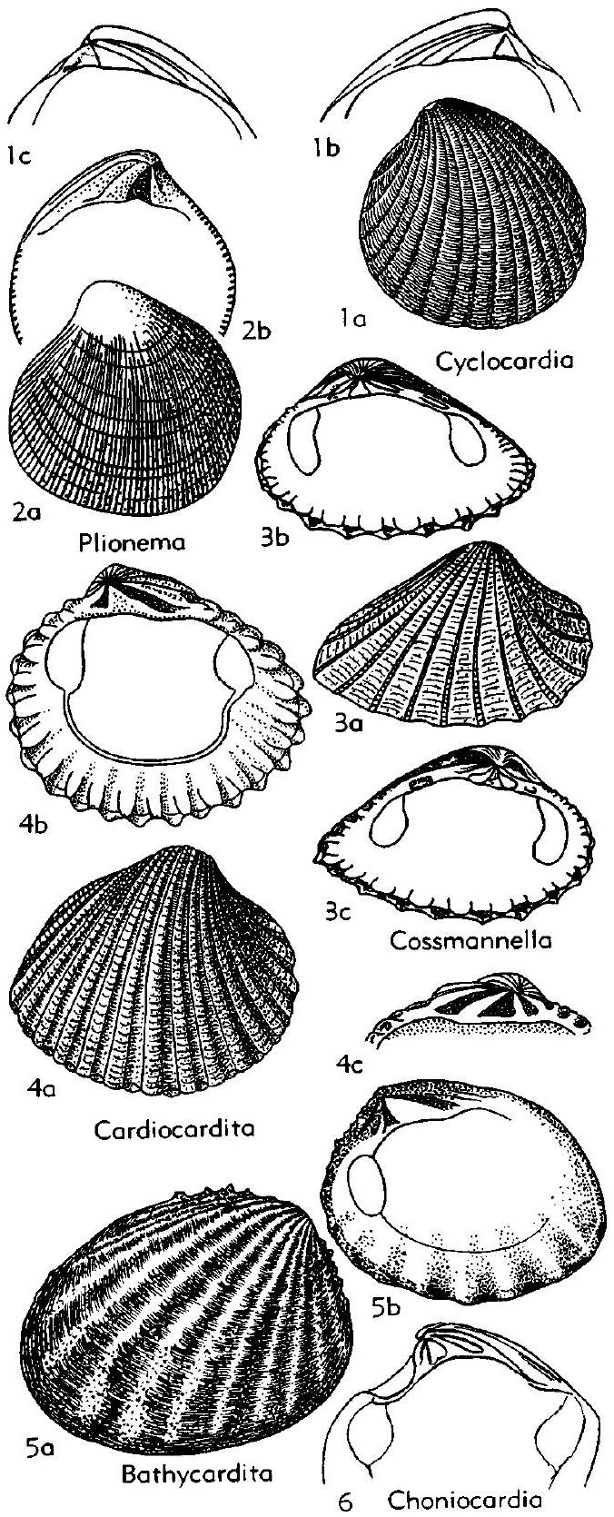 Inequilateral, subtrapezoidal, rounded in front, obliquely truncate at rear, with strong nodular or echinate ribs, beaks low. Hinge with trihedral cardinals, 3a very small, 3b straight, sharp-sided, at mid-hinge, anterior laterals minute, almost obsolete.