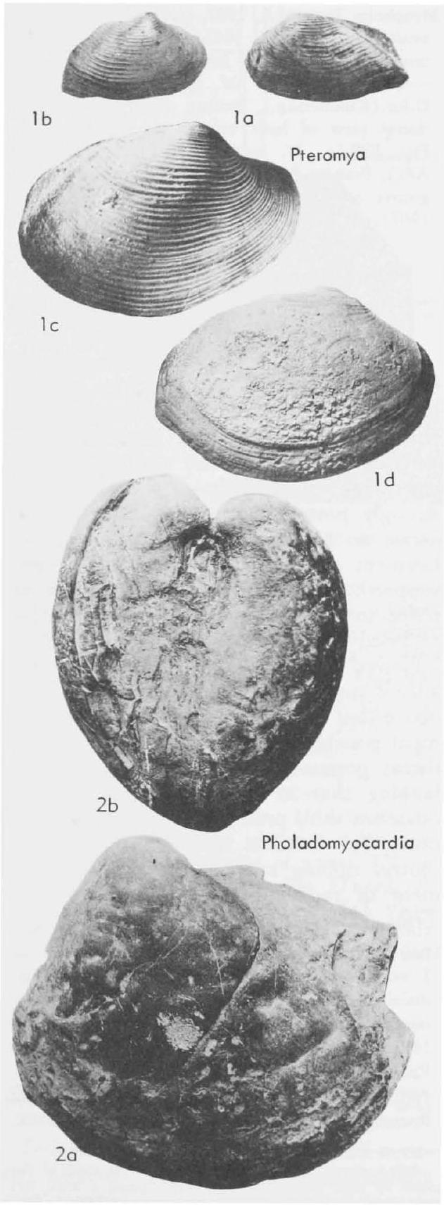 Fig. F18,2a,b. G. peregrina (PHILLIPS), U. Jue.(Oxford), Eng.; 2a,b, LV into mold showing pallial sinus, dorsal view of both valves showing slit extending back from beak in RV, X1.3 (Cox, n). --Fig. F18,2e. *G. gregaria (ZIETEN), M. Jur.(Bajoc), Gee.; LV ext., Xl (Schmidtill, 1926). --Fig. F18,2d. G. abdueta (PHILLIPS), M.Jur. (Bajoc.), Eng.; transv. sec. through hinge region short distance behind beaks, LV and RV as ori- ented, edge marked "X" giving rise to the slit on internal molds; X3.3 (Cox, n)