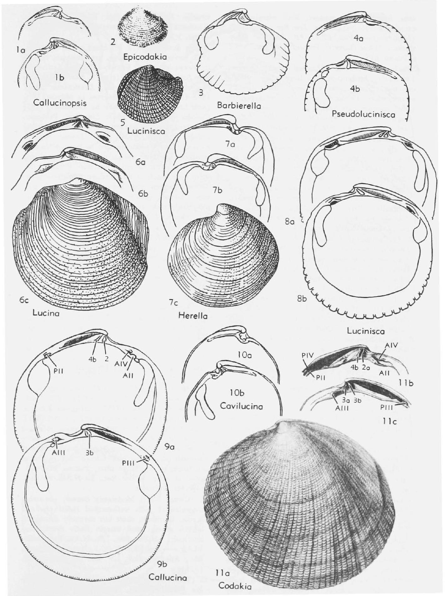 Medium-sized to large, subtrapezoidal, more or less flattened, with well-marked dorsal areas, sculpture of somewhat evenly spaced concentric lamellae with some areas smoother than remainder of disc, cardinals two, straight, 3a obsolete, 3b and 4b oblique and compressed, laterals with posterior ones distant, anterior scars elongate, inner shell margin with fine crenulations which tend to vanish. [For type species (vol. N-3 correction -- "Application to ICZN submitted by MYRA KEEN and R. TUCKER ABBOTT for conservation of Lucina in sense accepted by CHAVAN. Generic names published with figures but no descriptions by DESHAYES, 1857, are available, for the zoological Code (Art. 16,a,i) stipulates that pre-1931 names accompanied by illustrations but no descriptions are validly "indicated."]