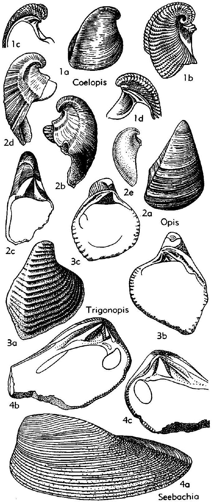 Obliquely oblong, with prominent beaks, Ventral margin curved in front of medioposterior undulation, posterior margin then truncated, Concentric ribbing, More or less shallow lunule, Large hinge, without laterals, one strong RV trigonal and 2 LV cardinals, commonly with their lateral faces striated, 4b stronger than 2, Ligament narrow, Margin more or less crenate.