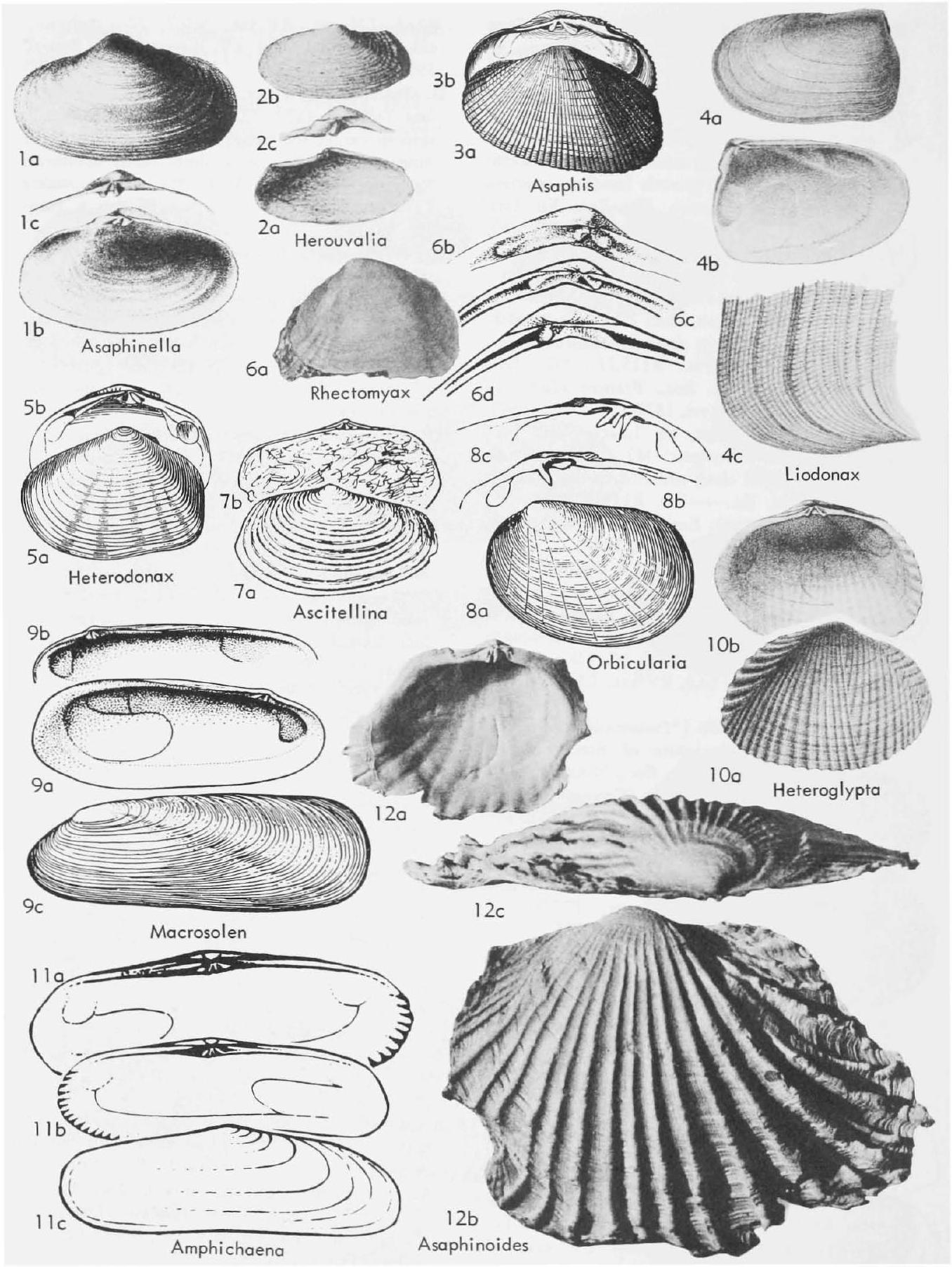 Fig. Ell6,8. *O. orbiculata (Wood), 8 a, LV ext., X1, 8 b, c, RV and LV hinges, enl. (124b).