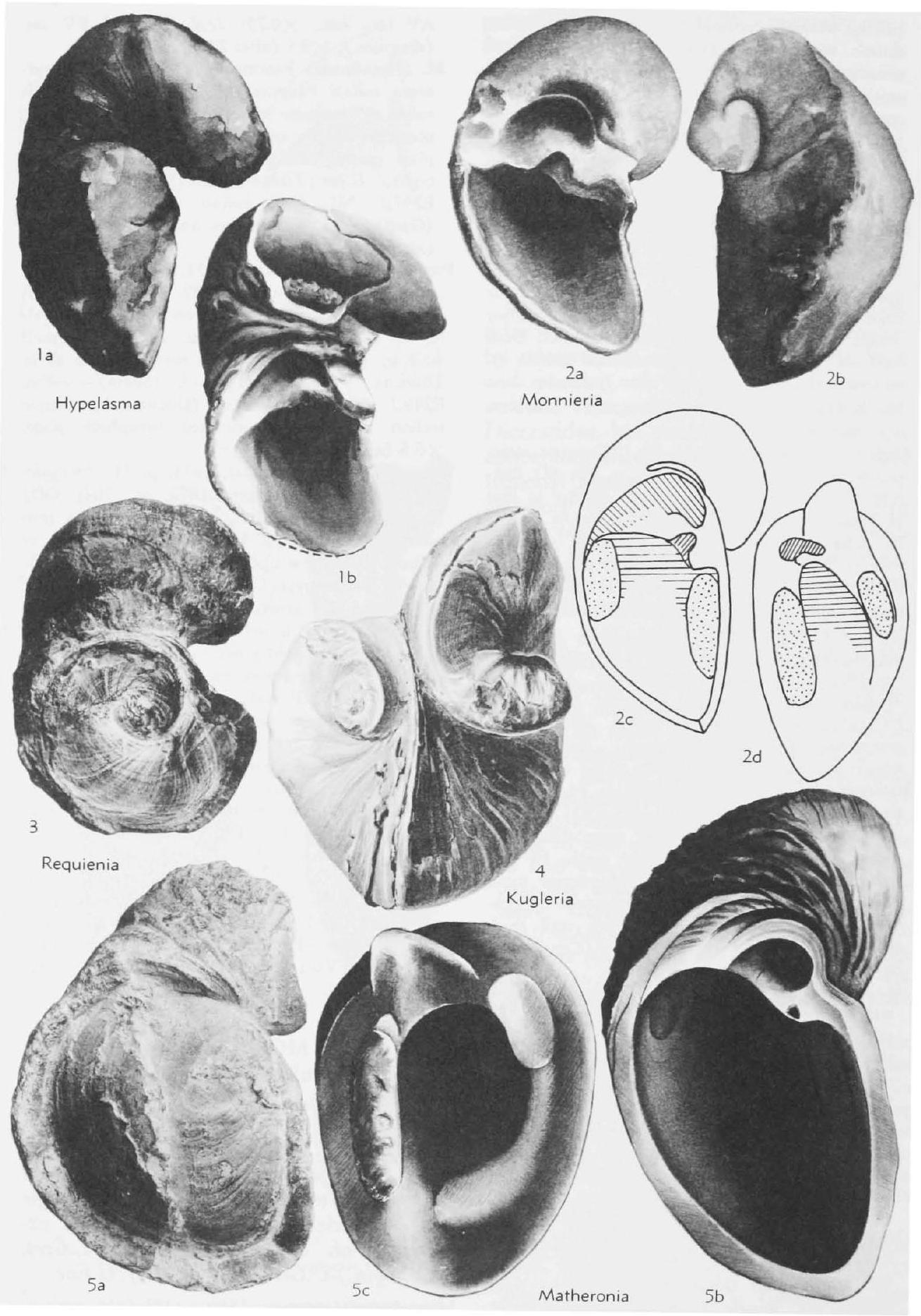 Fig. E247,3. *R. ammonia (Goldfuss), L.Cret.(U.Barrem.), France (Brouzet), both valves, X0.5 (278a), Fig. E246,1. R. sp., diagrams showing features of hinge, 1 a, b, AV and FV int., X0.7 (252)