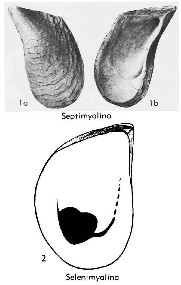 Prosocline, rhomboidal to falcate, or acline, thick-shelled myalines with slender extended beaks and obsolescent anterior lobe below each beak, both valves smooth or rugose, inequivalved